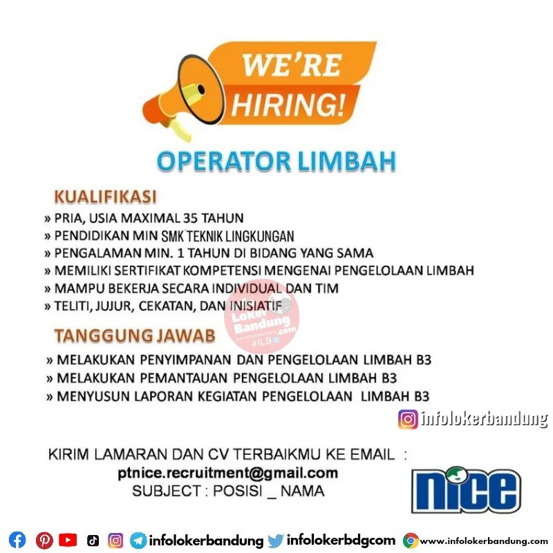 #ILBPT NICE INDONESIA saat ini membuka lowongan pekerjaan posisi sebagai:1. HR & GA2. Operator LimbahLihat Persyaratan & Kualifikasi pada Poster diatasKirimkan CV Lengkap dengan subject : posisi_nama ke email:ptnice.recruitment@gmail.com