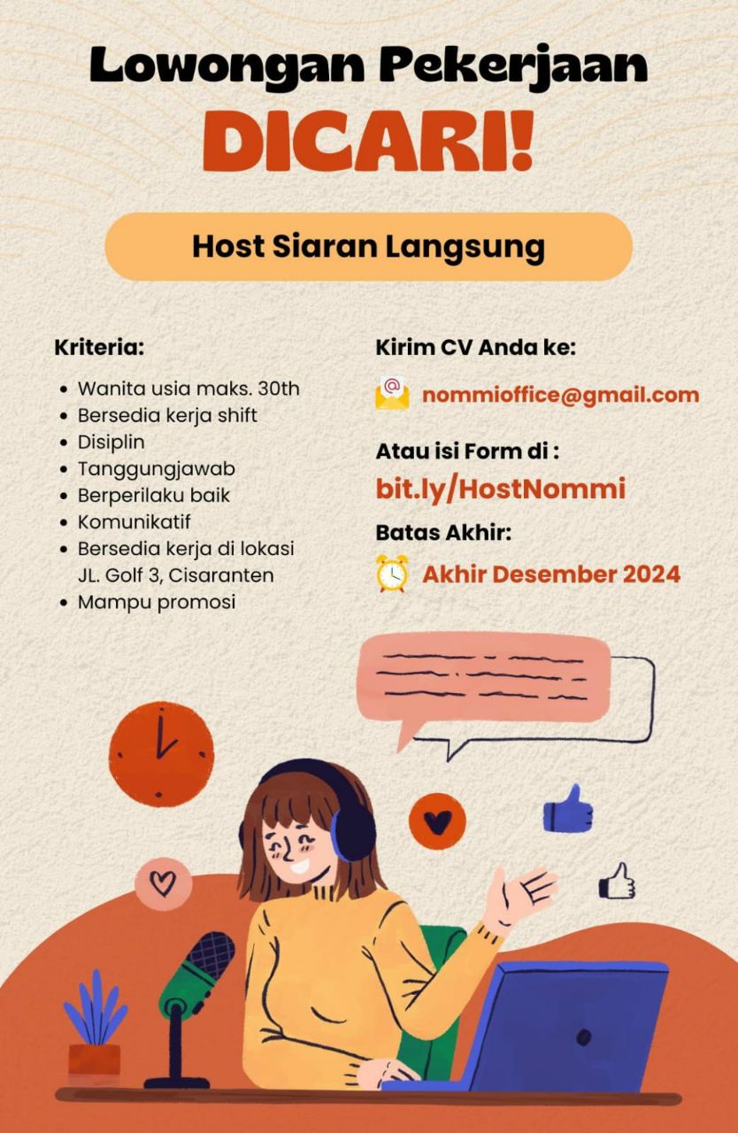 Kerja cuma 6 jam/hari loh! Yang penting kamu berani aktif berinteraksi dengan penonton di depan kamera, buat yang mau serius langsung apply lamaran kalian dan tunggu di hubungi pihak Nommi ya..
